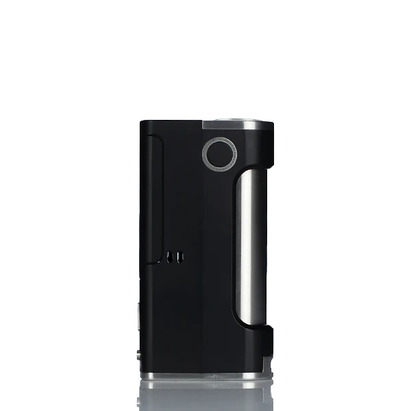 At the top of the Vidar V1.5 is a newly designed integrated drip tip that can be swapped out with the included flush nut, or any aftermarket Billet Box compatible integrated drip tip. A stainless steel top plate is integrated almost seamlessly into the delrin body and features a quick release 1/4 turn battery cap, with adjustment screw, to access the battery compartment. Positioned near the top, and on the side of the mod, is the firing switch for a comfortable operation of the mod. The main body of the Vidar is made from a single continuous piece of black delrin, and features an engraved stainless steel battery tube. At the front of the Vidar is a black delrin magnetic door panel that houses a boro style tank (sold separately), which can be swapped out with the included clear PMMA door panel or the Ultem door panel (sold separately). Below the Boro Tank housing is an accented VA logo along with the two power adjustment buttons. At the bottom of the mod is the DNA 60 screen, mounted in a stainless steel base plate.