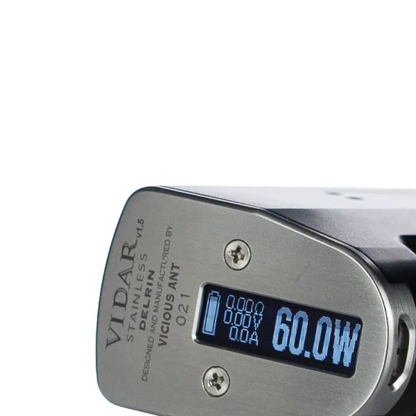 Vicious Ant presents the Vidar V1.5 18650 DNA 60 Boro Box Mod, a smaller version of the original Vidar with tasteful design upgrades! The Vidar is powered by an Evolv DNA 60 chipset, is compatible with Boro tanks, uses a single 18650 battery (sold separately), and is surprisingly compact and light weight. Vicious Ant displays their excellent engineering and craftsmanship with the Vidar, combining a sleek black delrin body with stainless steel accents. The Vidar V1.5 18650 measures in at 43.6mm x 39.15mm x 83.1mm, and weighs 4 ounces.
